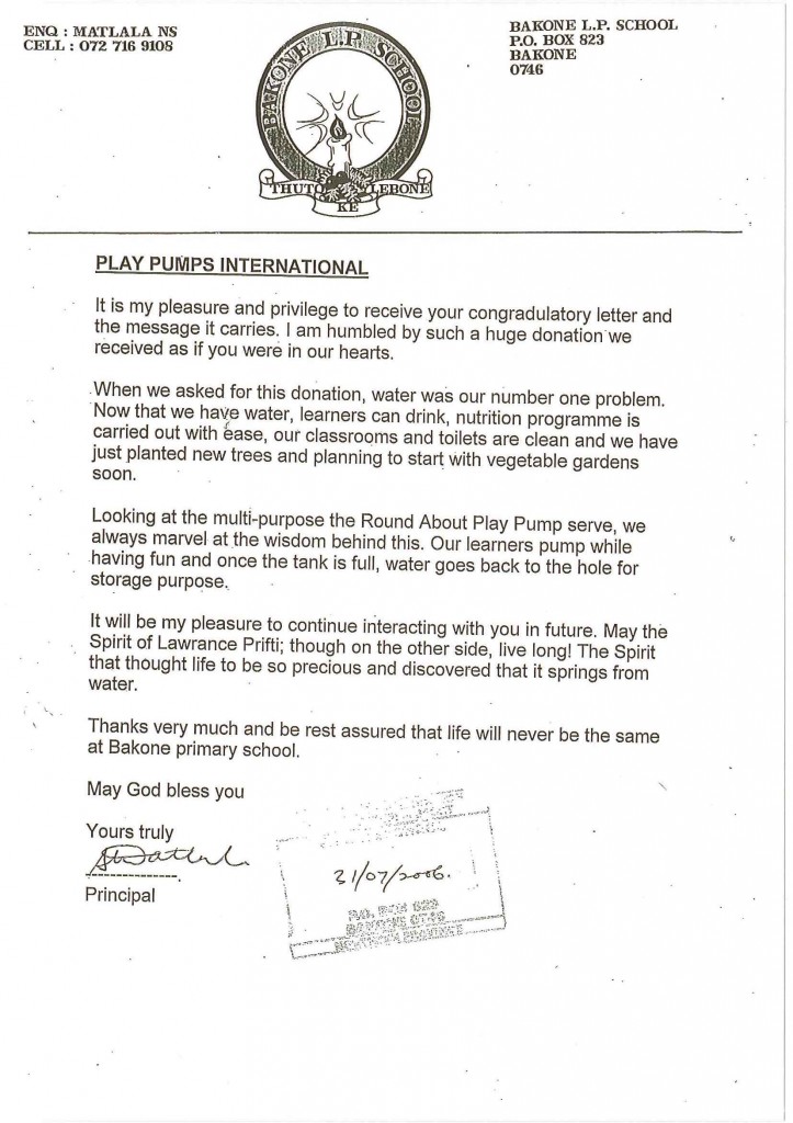 A letter from Bakone LP School who through the “Lawrence’s Roundabout Well Appeal” donation received a PlayPump.